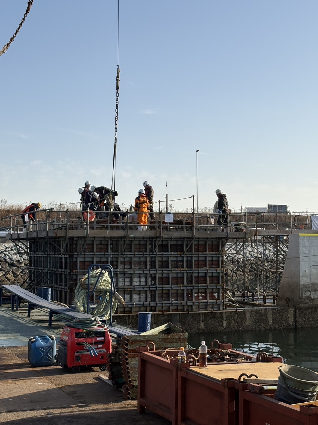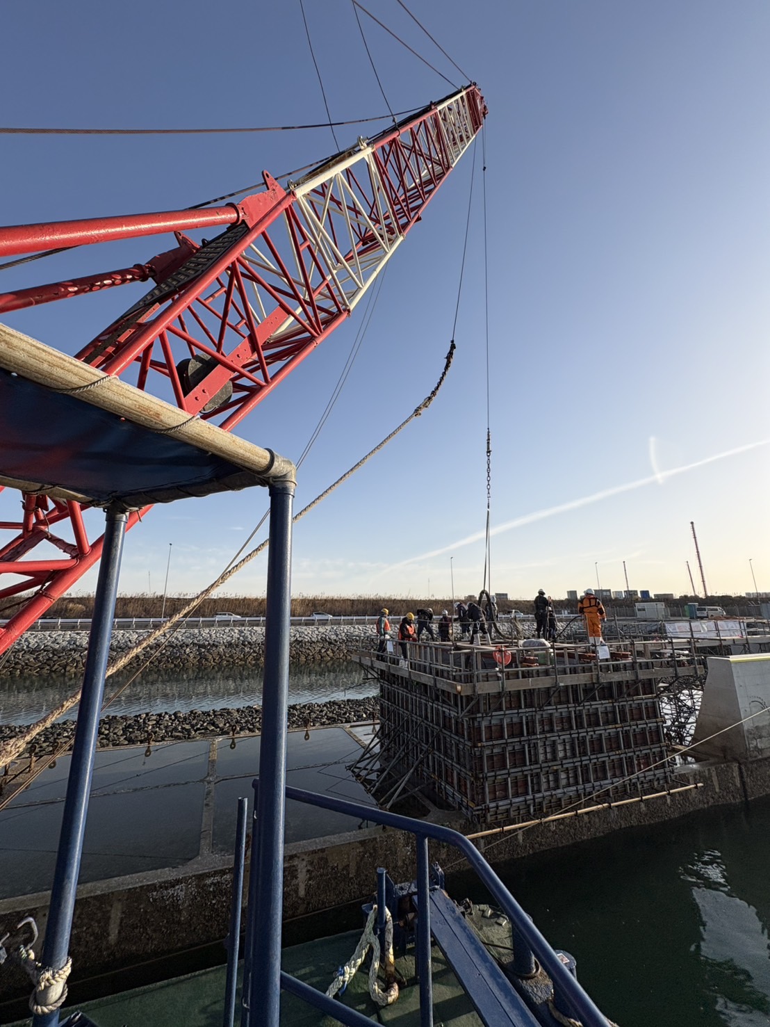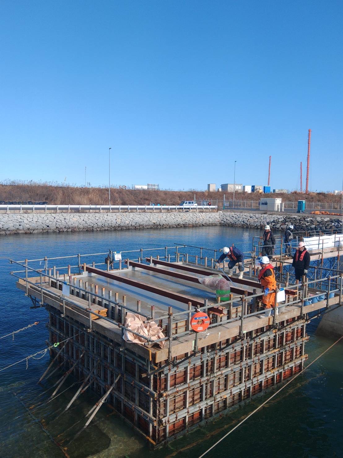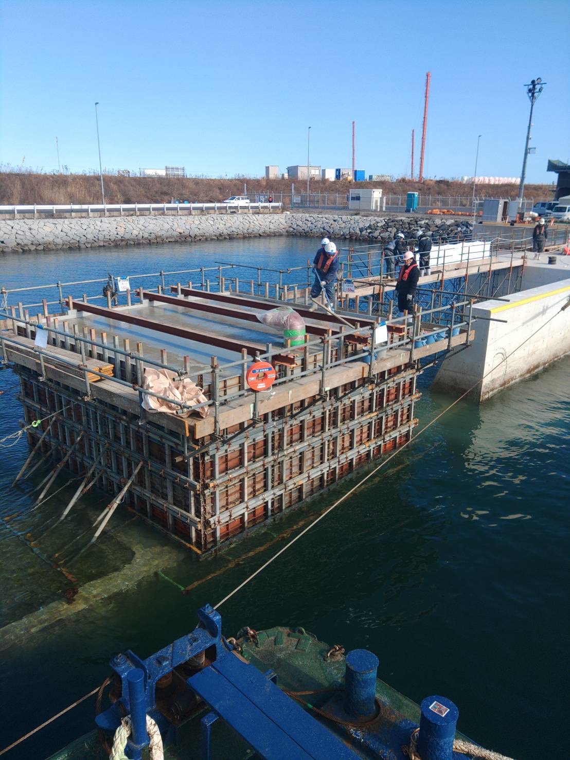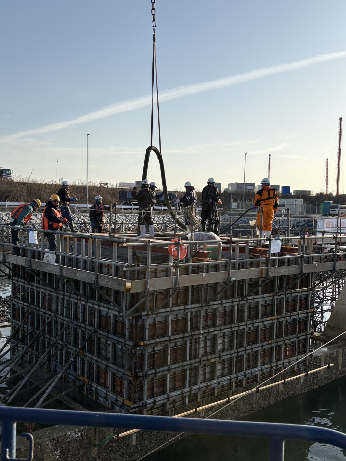 今回の作業では、ケーソン (箱状の巨大なコンクリート構造物)の上に生コンクリートを打設する工程を行いました。