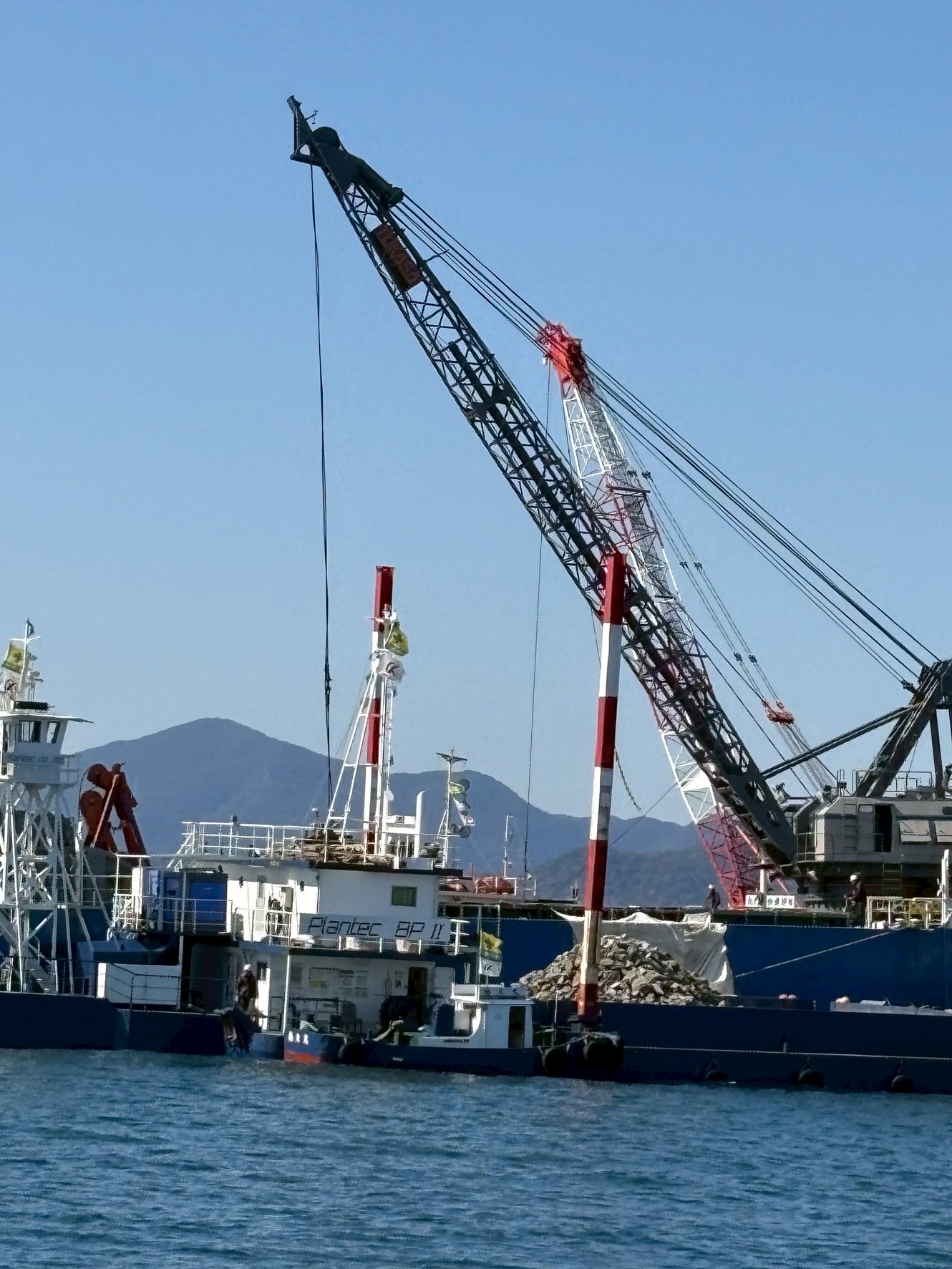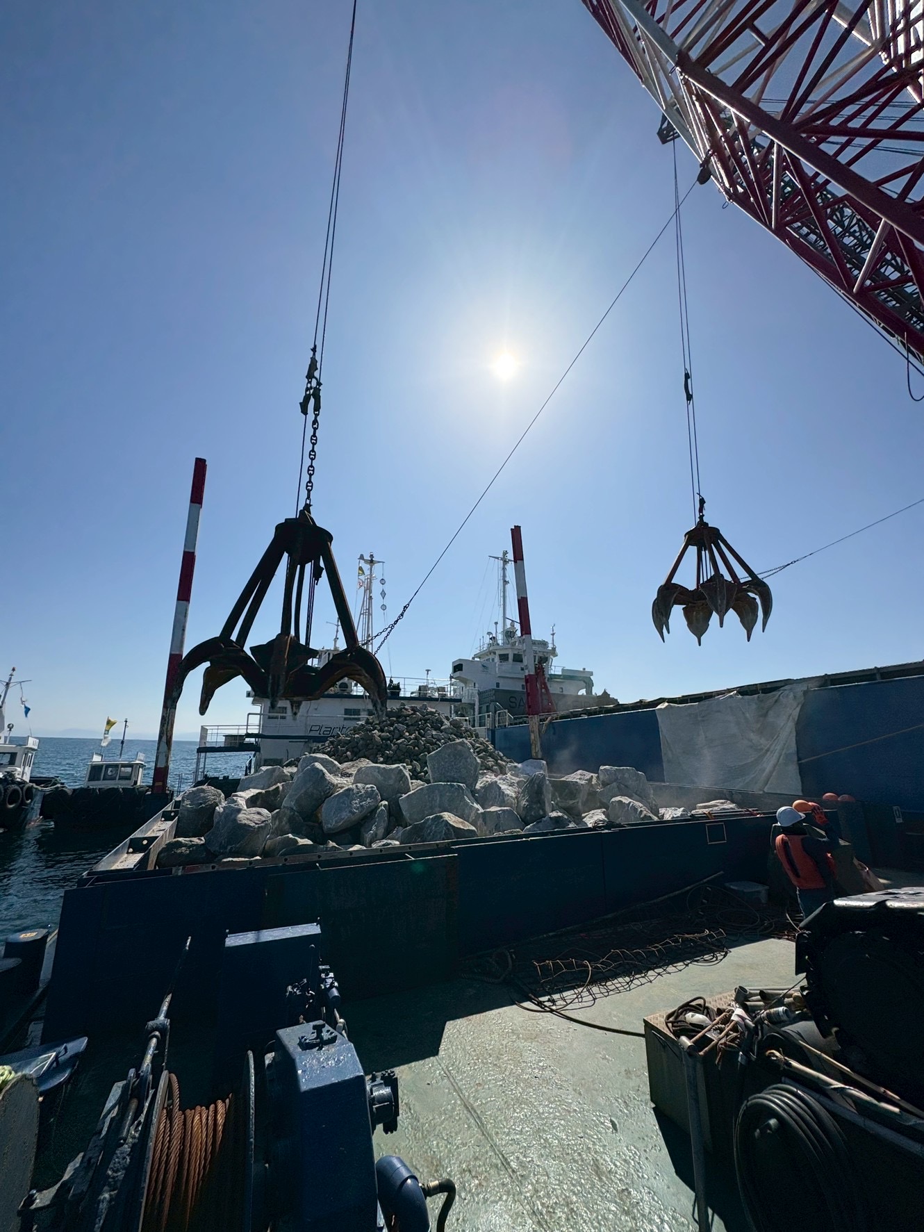 本作業では、ガット船 (クレーン付き運搬船)で搬送された被覆石を、沖合の台船へ一度降ろし、移し替えを行っています。
