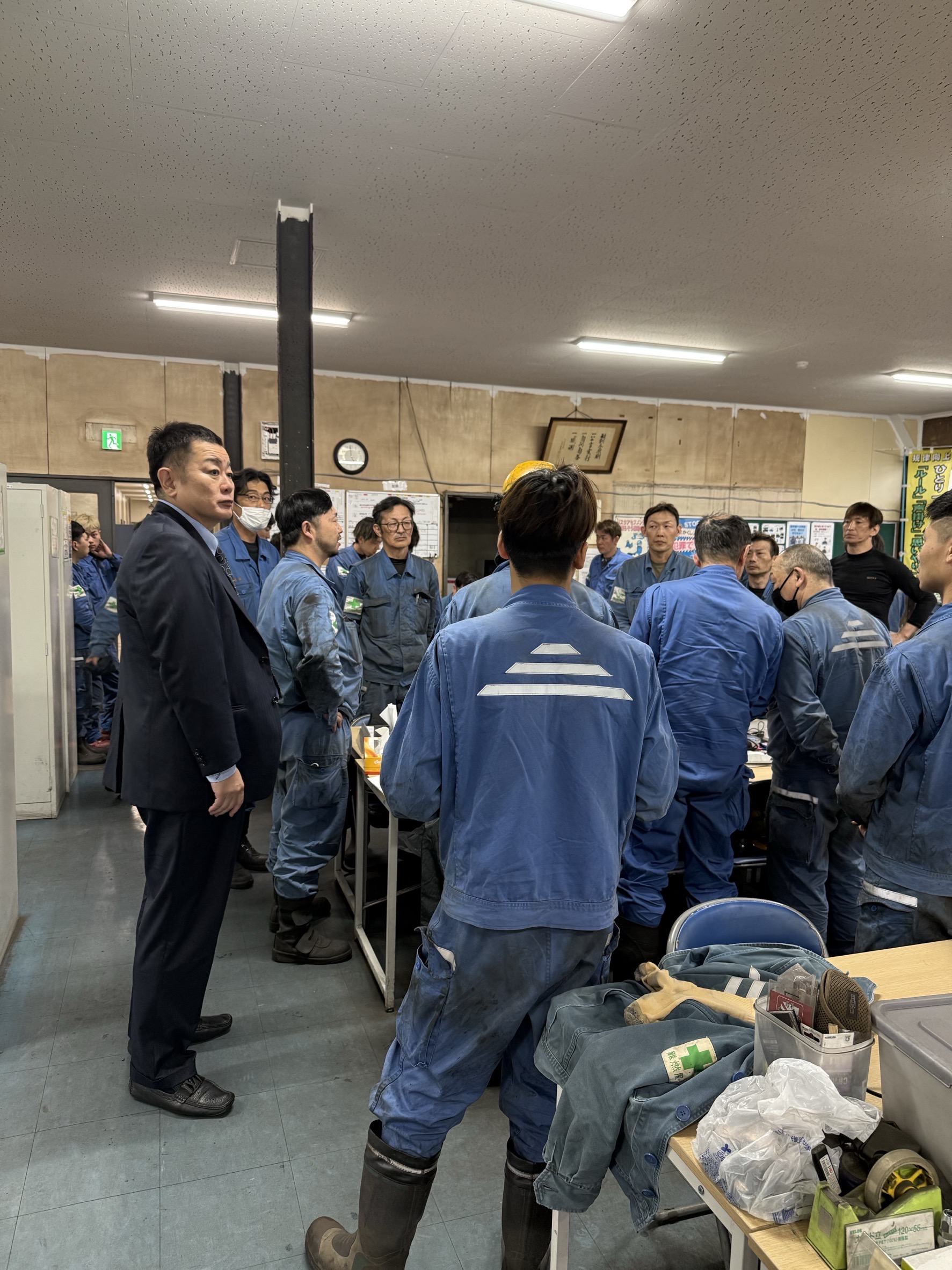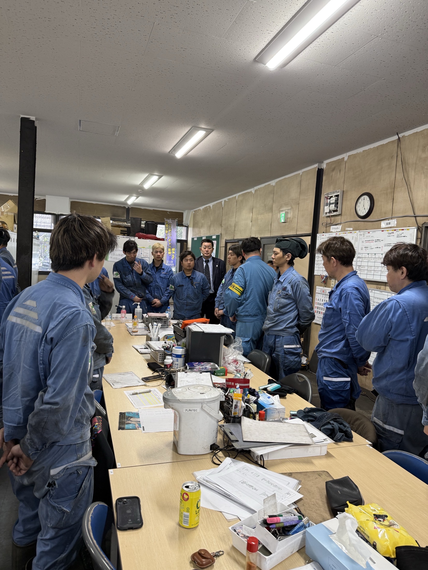 また、新年度を迎え新入社員が増えたことを受け、社長が現場の状況確認と激励のため構内を視察し、終了ミーティングにも参加されました。